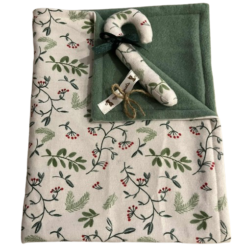 La couverture ChatouillisJouets Fait main ! Un côté en coton à motifs et un côté tout doux en polaire.